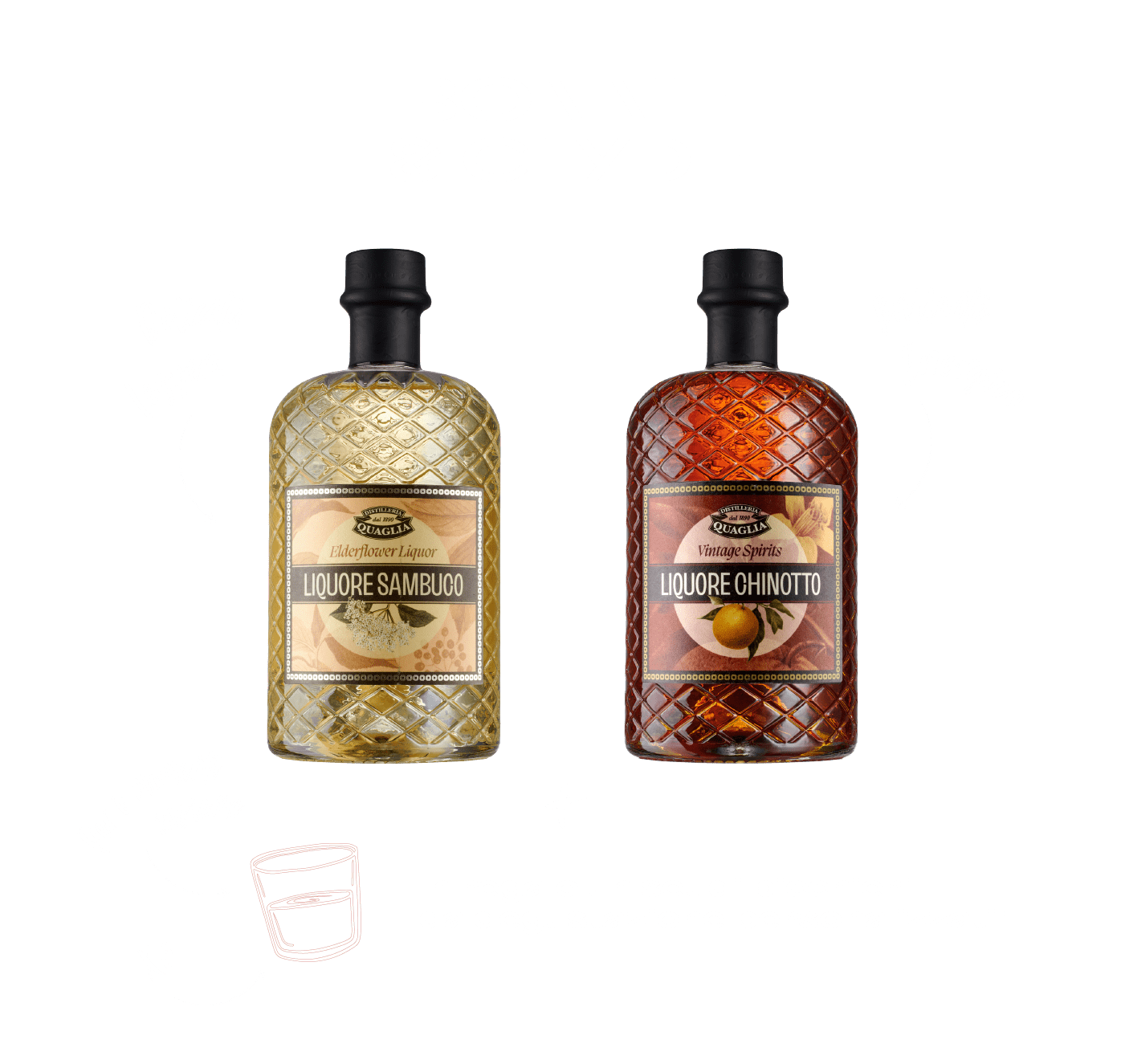 La luminosità e il profumo del liquore al Sambuco affiancando l’energia e la vivacità di quello al Chinotto in una coppia briosa e leggera che ispira avventure.