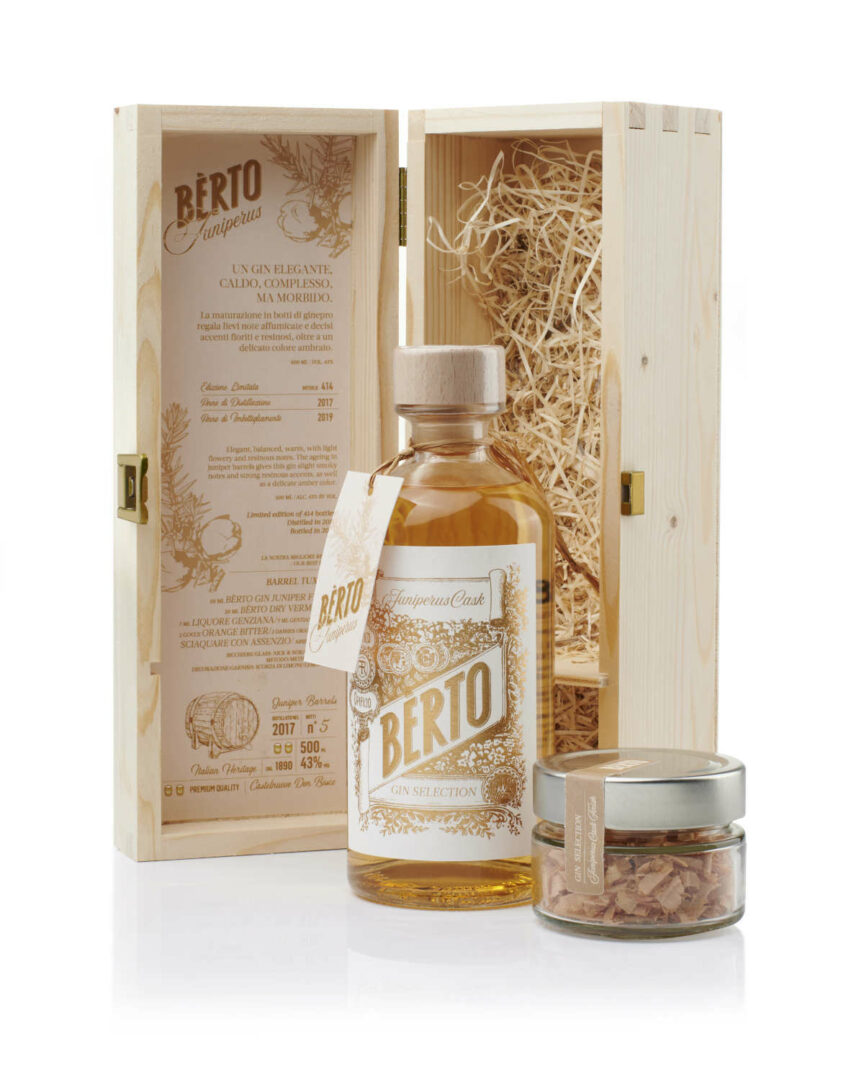 Una riserva raffinatissima e incredibilmente pregiata. Un gin elegante, caldo, complesso e morbido. La maturazione in botti di ginepro regala al Gin Bèrto lievi note affumicate e decisi accenti fioriti e resinosi, oltre a un delicato colore ambrato.